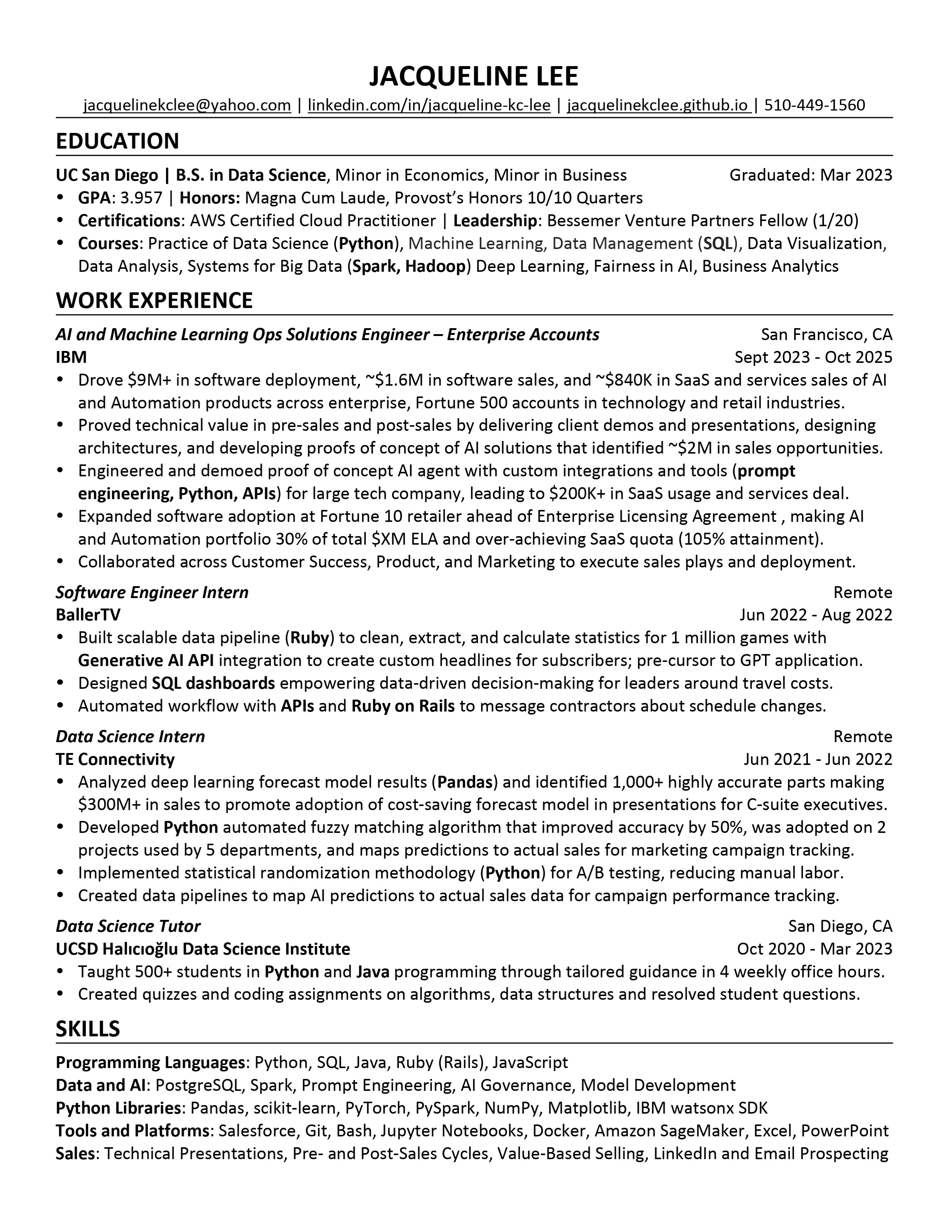 Hello! Iβm Jacqueline, early professional with experience in Technical Sales/Solutions Engineering, Software Engineering, and Data Science. For 2 years, I was an AI and ML Ops Technical Sales Engineer (aka Solutions Engineer) at IBM. I graduated from UC San Diego with a B.S. in Data Science and minors in Economics and Business in 2023. Here, youβll find details on my favorite Data Science projects, my work experience, and my education.