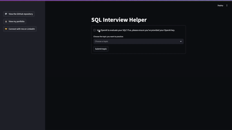 My portion was the SQL practice portion. Iβve taken that code and revamped it to use GPT-5 nano, and I also built a simple user interface leveraging Streamlit for users to more easily interact with the tool (an improvement from the Jupyter notebook I had submitted in 2022). Please see below for instructions on how to use my SQL Interview Helper. Iβve also uploaded a version that removes any OpenAI API usage thatβs available to check out live on Streamlit linked here and below. I hope this tool helps you hone your SQL skills and prepare for any interviews!